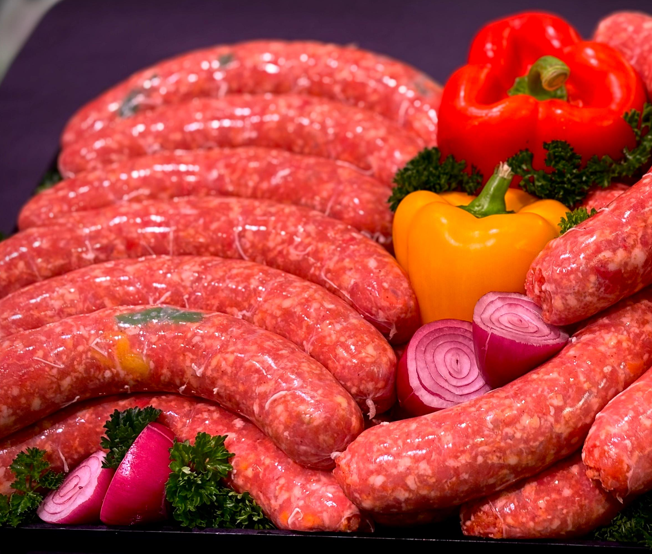 Unsere feine Bratwurst vereint saftiges Schweinefleisch mit aromatischem Cheddar und knackiger Paprika.